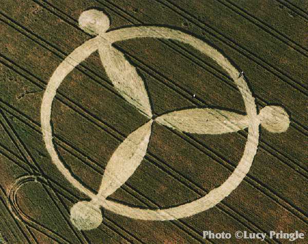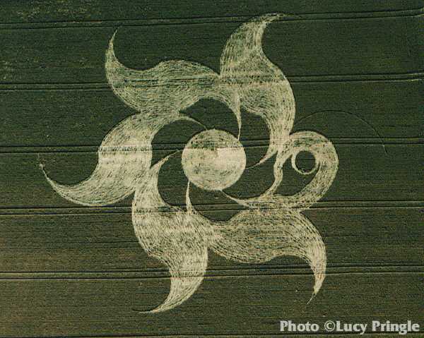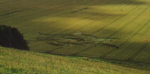 I walked over into the field, about 200 feet, and found two circles of about 7 feet and maybe 15 or 20 feet, connected by a arcing path about 3 feet across. Continuing the hunt, and encouraged that it may be pretty easy to find them, I headed down a dirt road and found an enormous formation in a thick barley field. It was July 19, 2000, and this one was much bigger. Perhaps 250 feet across. It had three, sort of,'petals' and the circular path around these thin football shaped petals was itself pretty wide. We took pictures and went on our way. After seeing a few less interesting patterns in the crops, we saw people walking up a high hill. Asking a couple from germany, we heard there was a good view of a formation from atop the hill. It was really fun. Not just to see the formations, but to see other people searching them out. |