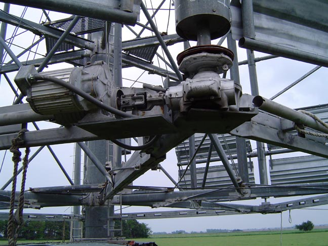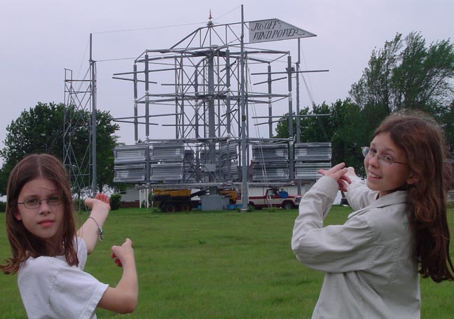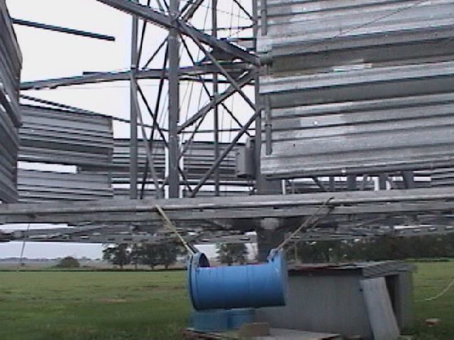 I recently had the pleasure of meeting Larry Josoff. Larry and his brother, Roy, have been designing and building a mechanized windmill as a hobby, which can only be described as a passion, for some 16 years now. Out in the fields of Nebraska, you can find more than just corn sometimes. The Josoff Wind Power windmill hardly stands out like the large tall propeller type modern windmills. It is built out of mostly galvanized power pole pieces with sails of galvanized steel. Don't let the 'farm building' appearance fool you. The corrogated steel sails are directed into the wind by computer controlled motors and the entire massive rotor turns a 'geared up' generator. With eighteen sails in three tiers of six each, the wind generator looks a bit like an amusement park ride. When I visited, Roy and Larry were still attaching the middle section to the lowest six sails.